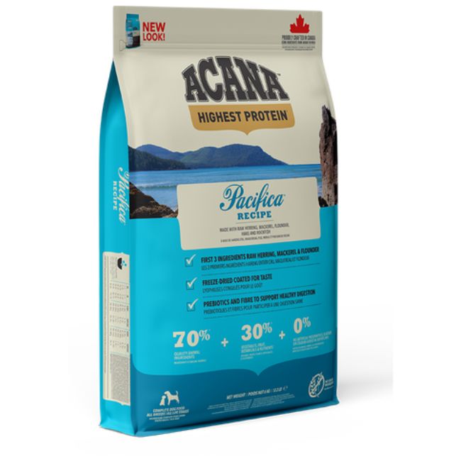 Alimento secco completo per cani di tutte le taglie e fasi di vita. Un alimento ricco di inclusioni di pesce nelle proporzioni della preda intera per fornire nutrienti essenziali come gli acidi grassi Omega in modo naturale. ACANA Pacifica Recipe contiene aringa, sgombro, passera del Pacifico, nasello atlantico e scorfano pescati in natura che vengono consegnati ogni giorno freschi o crudi* presso le nostre cucine da fornitori che conosciamo e di cui ci fidiamo. Le proporzioni della preda intera includono polpa, interiora e ossa, per garantire al tuo cane tutti i nutrienti di cui ha bisogno per mantenersi forte e in salute, con un gusto che certamente adorerà.