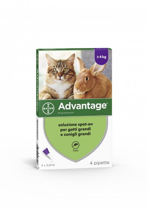 Il trattamento antipulci Advantage per gatti e conigli si applica direttamente sulla cute di gatto o coniglio e agisce entro 24 ore, eliminando in un solo giorno le pulci presenti sull’animale; un trattamento previene l’ulteriore infestazione da pulci per 3-4 settimane nei gatti e fino ad una settimana nei conigli. È una soluzione topica (spot-on) facile da applicare che uccide le pulci del gatto e del coniglio al contatto, prima che vengano punti. Adatto anche per gattini dalle 8 settimane di vita e conigli dalle 10 settimane d’età.