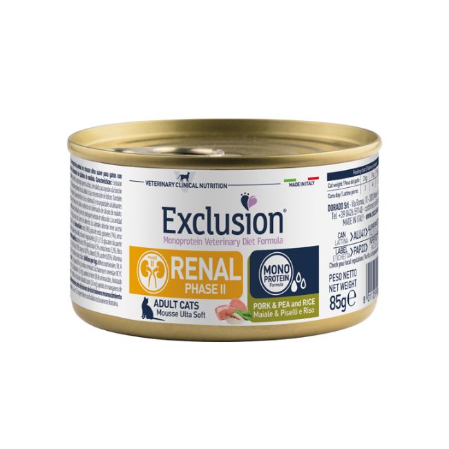 Exclusion Monoprotein Veterinary Diet Formula Renal Phase II è un alimento dietetico completo per gatti adulti formulato per il supporto della funzione renale in caso di insufficienza renale cronica. Questo alimento dietetico contiene un ridotto tenore di proteine di elevata qualità e una bassa concentrazione di fosforo. E’ indicato anche per la riduzione della formazione di calcoli a base di ossalati grazie alla bassa concentrazione di calcio, vitamina D e alle proprietà alcalinizzanti dell’urina.