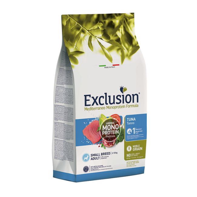 Exclusion Mediterraneo Monoprotein Formula – Noble Grain é un alimento completo e bilanciato formulato con una sola fonte proteica animale disidratata, per una ricetta chiara ed essenziale, e solo un cereale nobile di alta qualità. È preservato con antiossidanti naturali e integrato con Beta-glucani. È realizzato con una innovativa ricetta di Superfood della tradizione Mediterranea: Canapa, Olio d’Oliva, Pomodoro, Melagrana, Broccolo e Cicoria. Senza grasso di pollo, frumento, soia e mais aggiunti.