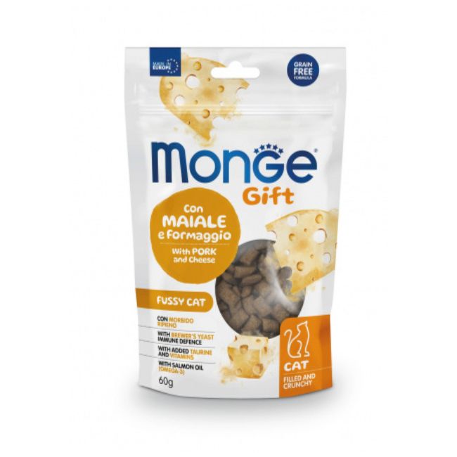 Monge Gift Fussy Cat con Maiale e Formaggio è un alimento complementare per gatti adulti. Specificamente studiato per il benessere del tuo gatto grazie a uno strato esterno croccante per favorire l’igiene dentale e a un morbido ripieno di formaggio per stimolare i palati più raffinati. Un prodotto formulato senza cereali e con maiale per ottimizzare l’appetibilità e la digeribilità dell’alimento. La formula è arricchita con taurina per supportare l’acutezza visiva e la regolare funzionalità cardiaca e con vitamine per la vitalità quotidiana. L’inclusione di ingredienti funzionali, come il lievito di birra per supportare le difese immunitarie e l’olio di salmone, fonte di omega 3, è frutto della ricerca Made in Italy. Senza conservanti e zuccheri artificiali aggiunti.