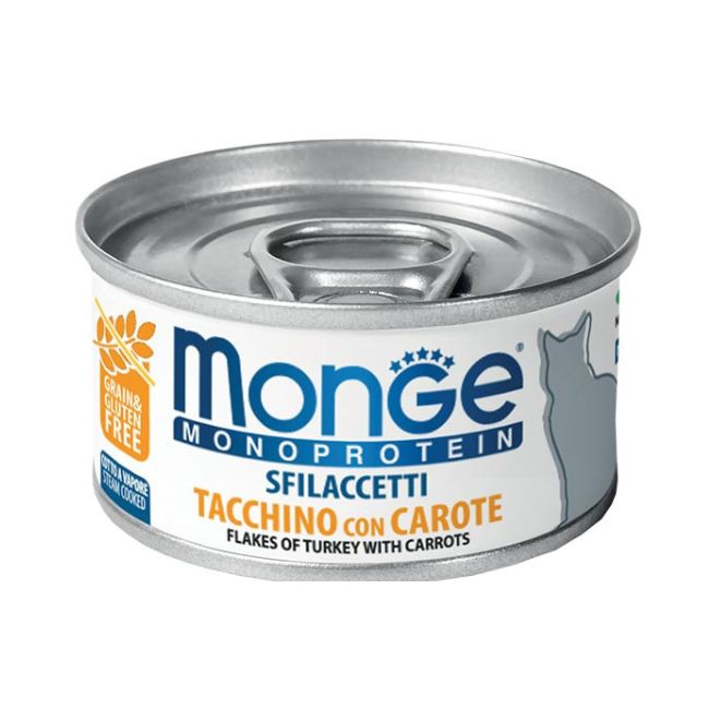 Monge Monoprotein Superpremium è la linea che si inserisce al livello più alto delle proposte Monge.Laqualità elevataègarantita da prodotti formulati con materie prime, selezionate e studiate appositamente per ogniricettapriva di coloranti e conservantiaggiunti. Ogni alimento sarà per il gatto una vera deliziagrazie all’utilizzo di carnifresche diprima scelta e alla presenza di preziosi elementi per le loro proprietà nutritive. Ricette dai gusti ricercati adatti ancheai palati più raffinati che aiutano il gatto a mantenersi in forma e con un buon livello di energia.Composizione:Tacchino 65% (pari al 100% della carne utilizzata), carote 4,2%, oli e grassi vegetali (olio di girasole raffinato), sostanzeminerali.Componenti analitici:Proteina grezza: 12,3%, Fibra grezza: 0,5%, Grassi grezzi: 4,0%, Ceneri grezze: 0,9%. Umidità: 80,5%.Additivi nutrizionali/KG:Vitamina A (Acetato di retinile): 1.500 UI, Vitamina D3 250 UI, Vitamina E (tutto-rac-alfa-tocoferile acetato) 25 mg, Zinco(Ossido Di Zinco 20mg) 16mg, iodio (iodato di calcio anidro 1,5mg) 0,97mg, ferro (solfato di ferro (II) monoidrato 25mg)8,2mg, Taurina 500 mg.