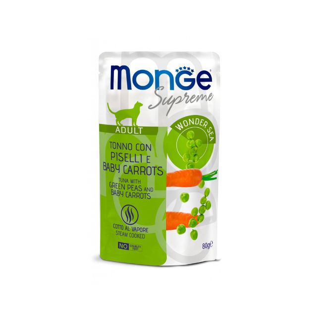 MONGE SUPREME GATTO ADULTO TONNO CON PISELLI E BABY CARROTS è un alimento bilanciato per gatti adulti. Formulato appositamente per favorire il mantenimento del peso corporeo ideale del tuo gatto grazie alla presenza di piselli, fonte di carboidrati a ridotto indice glicemico. Il primo ingrediente è il Tonno dell’oceano e la formulazione è arricchita con Frutto-oligosaccaridi (FOS), prebiotici che supportano il benessere intestinale. Ingredienti ricercati come le baby carrots, particolarmente ricche di fibre vegetali e antiossidanti, contribuiscono a neutralizzare i radicali liberi e supportano la qualità di vita quotidiana dei nostri gatti.