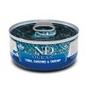 COMPOSIZIONEtrancio di tonno (60%), filetto di merluzzo (5%), zucca (5%), gamberetto (5%), olio di pesce, grasso animale, fruttoligosaccaridi, solfato di condroitina, glucosamina, vitamine, minerali.ADDITIVI PER KG ADDITIVI PER KGAdditivi nutrizionali: Vitamina A 4800UI; Vitamina D3 320UI; Vitamina E 160mg; Cloruro di colina 501mg; Zinco (chelato di zinco dell’analogo idrossilato della metionina): 36mg; Manganese (chelato di manganese dell’analogo idrossilato della metionina): 6.8mg; Ferro [chelato di ferro (II) di idrato di glicina]: 16.8mg; Rame (chelato di rame dell’analogo idrossilato della metionina): 2.9mg; DL-metionina, tecnicamente pura 1500mg; Taurina 800mg; L-carnitina 50mg.COMPONENTI ANALITICIComponenti analitici: umidità 76.00%; proteina grezza 15.00%; grassi grezzi 4.00%; fibre grezze 0.70%; ceneri grezze 3.50%.VALORE ENERGETICOEM Kcal/Kg 987 – Mj/Kg 4,13