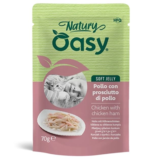 Squisito pollo con prosciutto di pollo, senza aromatizzanti, coloranti né conservanti artificiali aggiunti, in gelatina naturale ancora più morbida per una consistenza irresistibile e succulenta, in pratiche buste da 70 g.