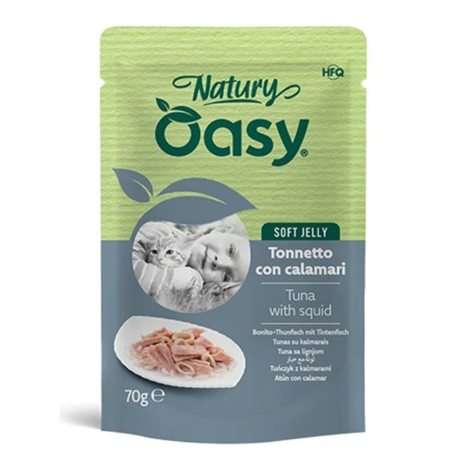 Squisito tonnetto con calamari, senza aromatizzanti, coloranti né conservanti artificiali aggiunti, in gelatina naturale ancora più morbida per una consistenza irresistibile e succulenta, in pratiche buste da 70 g.