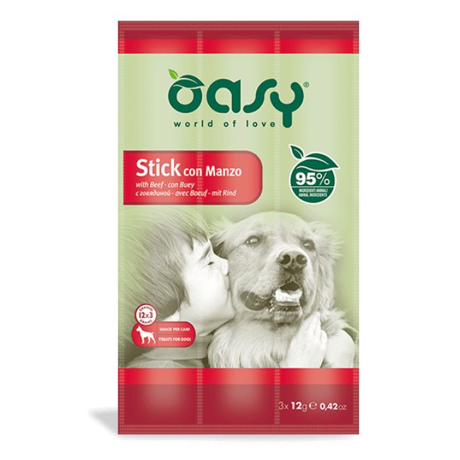Gustosi stick con manzo preparati con il 95% di ingredienti animali. Ideali per deliziare il tuo cane.