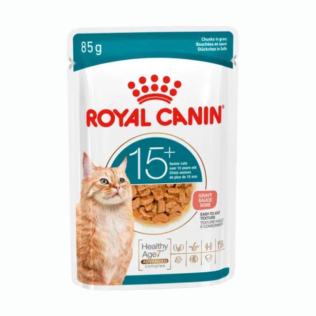 ROYAL CANIN Ageing 15+ bocconcini in salsa è un alimento umido completo e bilanciato indicato per gatti di oltre 15 anni di età.