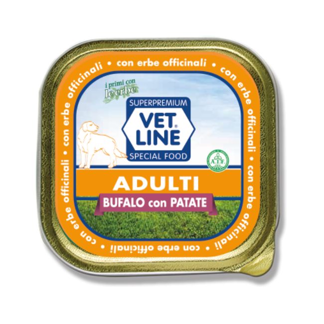 Composizione: Bufalo 80% (100% delle carni), patate 15%, olio di semi, sostanze minerali, erbe officinali (0,05%) (Lino, Ortica folia, Tarassaco, Eleuterococco, Echinacea, Ginseng, Aglio), vitamine. Additivi tecnologici: Addensanti e gelificanti.